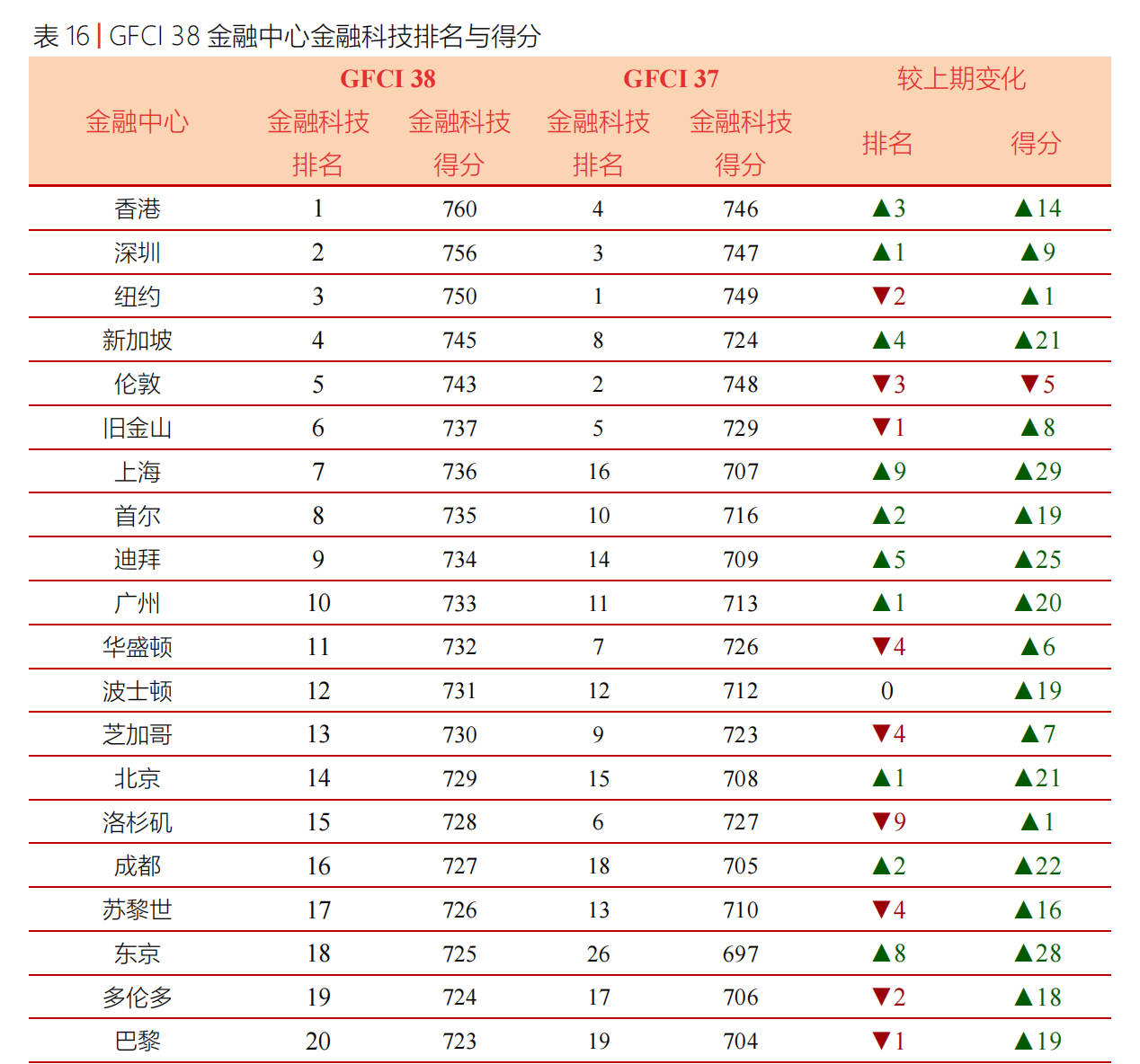 所有上榜的内地金融中心评分均有提升,8个中心排名上升,包括广州(上升1位,全球第33)、成都(上升1位,全球第38)、杭州(上升5位,全球第58)、大连(上升4位,全球第70)、南京(上升2位,全球第74)、武汉(上升3位,全球第76)、天津(上升1位,全球第81)、西安(上升9位,全球第82)。