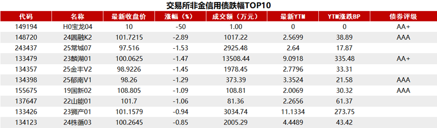 据Choice 数据统计显示,今日交易所市场非金信用债跌幅排行前五的分别是:H0宝龙04、24圆融K2、25常城07、23麟湖01、25金丰V2。具体如下: