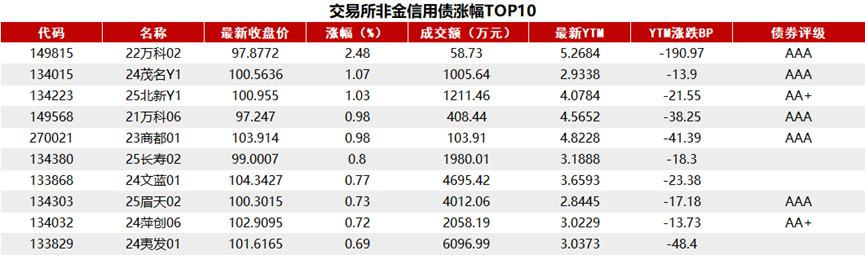 据Choice 数据统计显示,今日交易所市场非金信用债涨幅排行前五的分别是:22万科02、24茂名Y1、25北新Y1、21万科06、23商都01。具体如下: