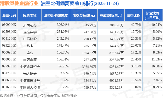 从沽空比例偏离度来看,招商证券、连连数字、山高控股沽空比例偏离度位居行业前三,分别为326.04%、254.05%、243.28%。