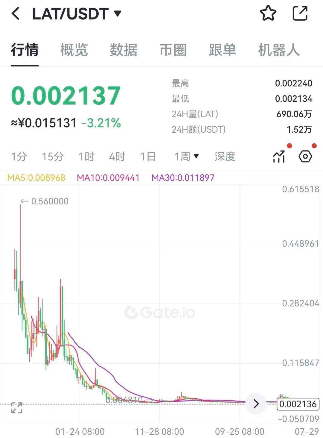 此外,HashKey曾发行的自有代币HSK表现亦不尽如人意,目前市值仅3000余万元,较历史最高点跌幅接近90%。HashKey董事会主席肖风还曾主导发行虚拟货币LAT亦出现暴跌,最高曾涨至5美元,最新价格仅为0.0022美元。