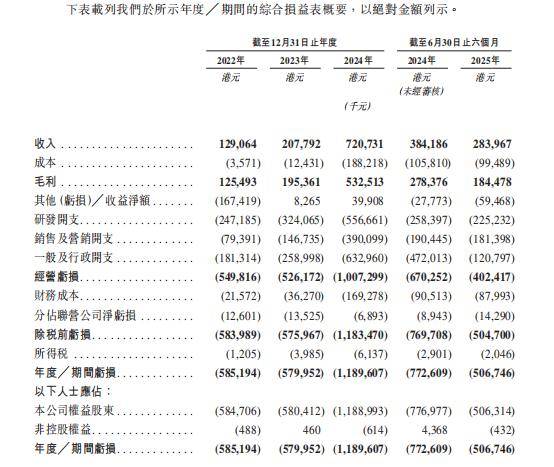 盈利方面,公司仍处于投入期,2022年至2024年及2025年上半年分别录得亏损5.85亿港元、5.80亿港元、11.90亿港元及5.07亿港元。毛利率则呈现逐步下降趋势,从2022年的97.2%降至2025年上半年的65.0%,反映出业务扩张过程中运营成本的上升。值得注意的是,公司客户集中度显著改善,来自五大客户的收入占比从2022年的79.6%降至2025年上半年的22.8%,单一最大客户收入占比从52.8%降至12.3%,业务抗风险能力持续增强。