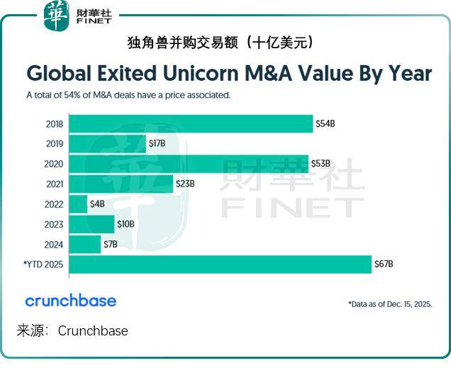 Crunchbase的数据显示,2025年的大型并购交易或有36宗,包括谷歌(GOOG.US)以320亿美元收购网安公司Wiz,金融科技公司Naver以103亿美元收购韩国加密货币交易所Dunamu等。Crunchbase估算,今年以来独角兽的并购交易总额或达670亿美元,明显高于过去几年,见下图。