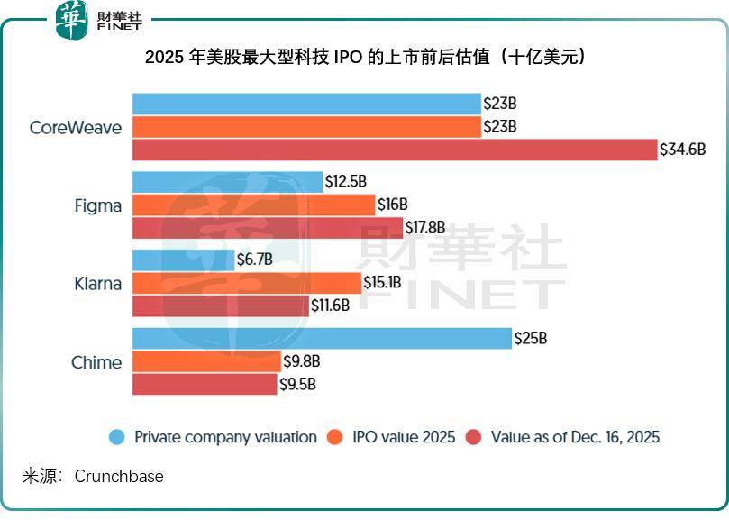 尽管IPO通常能为独角兽提供更大的估值上升空间,同时也是一个有效的价值发现机制,当上市前估值过高时,公共投资者也并不买账。见下图,Coreweave和Klarna无论是IPO估值还是上市后价值,均较上市前有明显的增长,但是Chime上市后却无所遁形,上市后估值显著下滑。