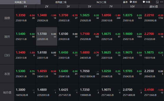 具体来看,银行间主要利率债收益率涨跌不一,截至下午16:30,10年期国债活跃券250016收益率上行0.25bp报1.8375%,30年期国债活跃券2500006收益率下行0.2bp报2.221%,10年期国开活跃券250215收益率上行0.2bp报1.9%。