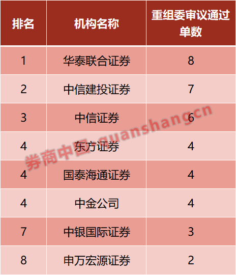 在沪深北交易所并购重组委审议方面,2025年,上交所共召开23次并购重组审核委员会会议,深交所共召开17次并购重组审核委员会会议,北交所召开1次并购重组审核委员会会议,合计审议通过40单行政许可类重组交易,涉及独立财务顾问49家次,担任超过1单交易独立财务顾问身份的券商共有8家。数据显示,重组业务“领头羊”华泰联合证券、中信建投证券、中信证券领跑市场,具体如下: