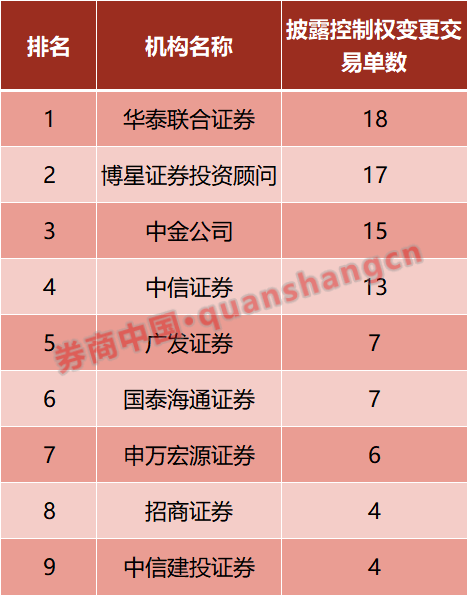 在并购重组市场整体活跃的背景下,上市公司控制权变更市场亦成为资本布局的关键领域,交易活跃度显著提升,能够主导或深度参与复杂交易的机构仍集中于头部财务顾问。根据Wind全球并购库数据统计,2025年首次披露上市公司控制权变更交易涉及财务顾问183家次,其中担任超过4单交易财务顾问身份的券商共有9家,具体如下: