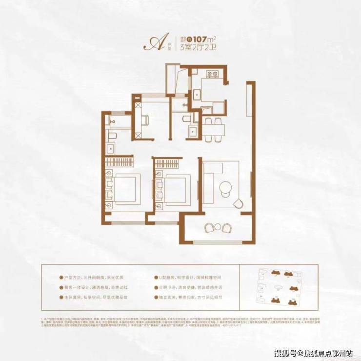 建面约107㎡三房的户型,三开间朝南,大面宽阳台,餐客厅一体,还有精细化收纳体系,人性化细节设计,极具功能性与舒适性,满足高阶精致生活。