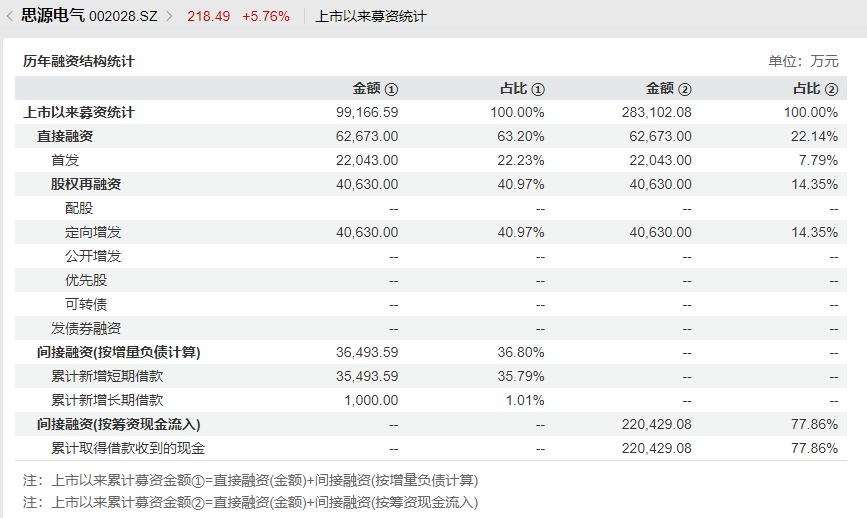 根据wind数据统计显示,自思源电气自2004年登录A股市场以来,公司累计从市场募集资金9.91亿元,其中直接融资6.26亿元,首发上市融资2.2亿元,通过定向增发融资4.06亿元;公司间接融资3.649亿元。