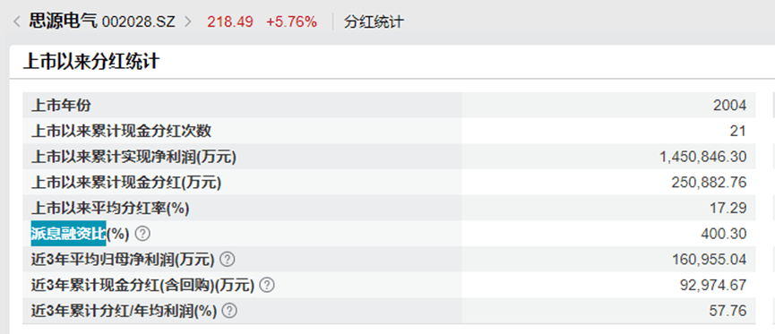 根据wind数据统计显示,思源电气上市以来上市以来累计实现净利润145亿元,累计现金分红次数为21次,累计现金分红25亿元,上市以来平均分红率为17.29%,派息融资比为400%。