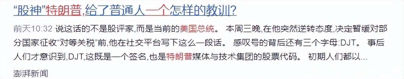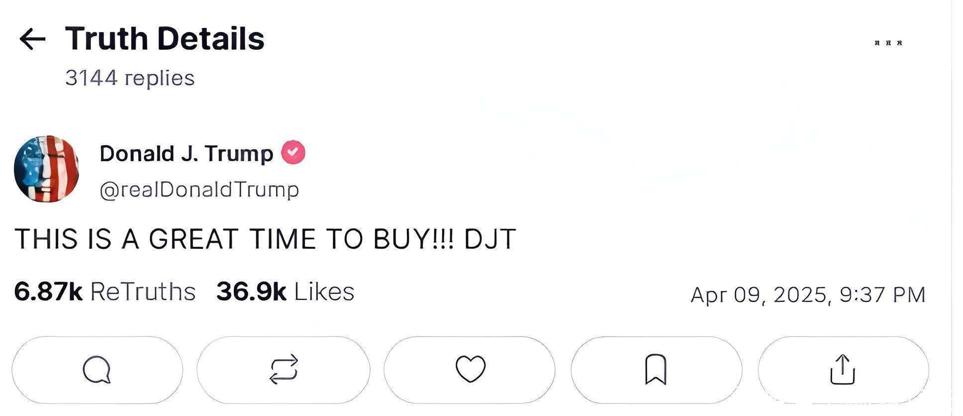 第二步,公开喊单。4月9日,特朗普在自己的社交平台Truth Social上发文,声称此时正是购买他自己股票的绝佳时机。为了强调,他还用了全大写字母。
