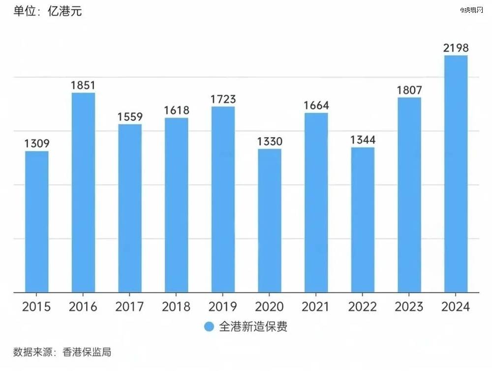 历史数据来看,港险新单保费除了疫情严重的2020和2022年,其他年份大都有增长,2024年更是大增了22%。