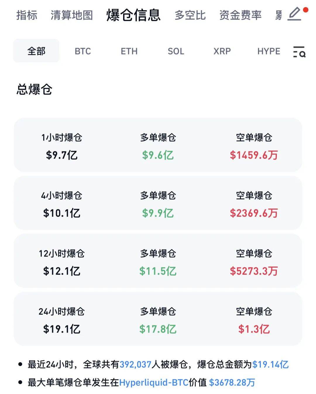 Coinglass数据显示,过去的24小时内,加密货币全网合约爆仓19.14亿美元,爆仓人数达到39.2万人。其中,多单爆仓17.8亿美元,空单爆仓1.3亿美元。最大单笔爆仓单发生在Hyperliquid-BTC,价值3678.28万美元。