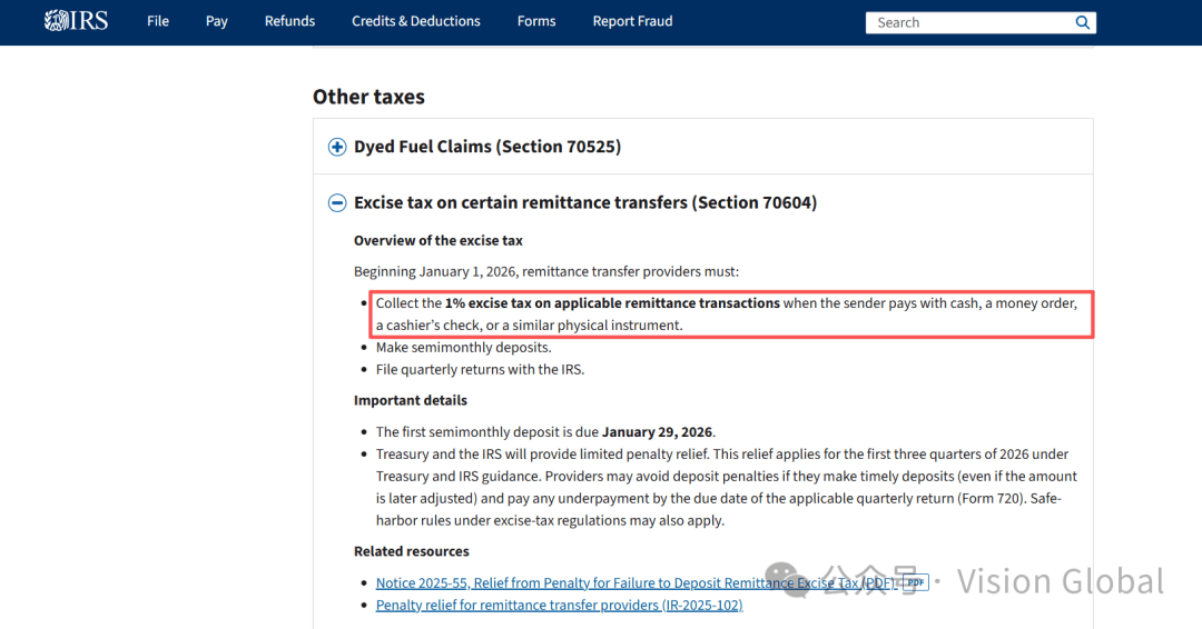 主要针对在美国境内,通过现金、汇票或银行本票等线下方式汇往境外的个人资金,税率为1%。汇款机构(包括银行、便利店汇款点及Western Union等汇款公司)将在操作时直接代扣并上缴至美国财政部。